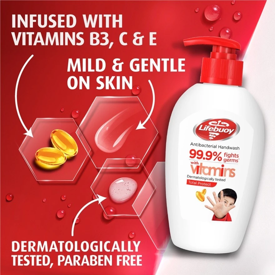 Ensure complete hand hygiene with Lifebuoy Total Protect Handwash. Trusted by millions, Lifebuoy’s signature antibacterial formula provides total protection against 99.9% of germs, keeping your hands safe and refreshed. With a rich lather and mild scent, it’s ideal for everyday family use.